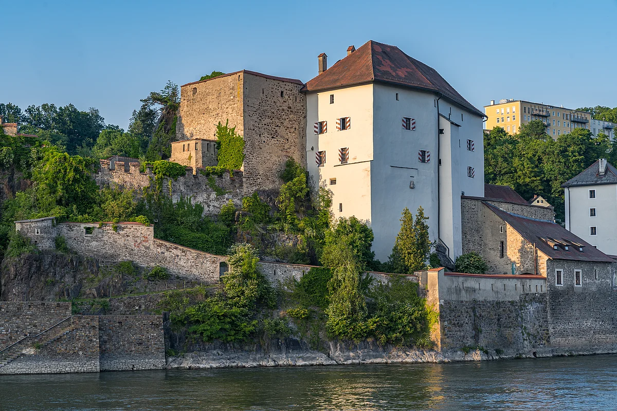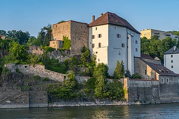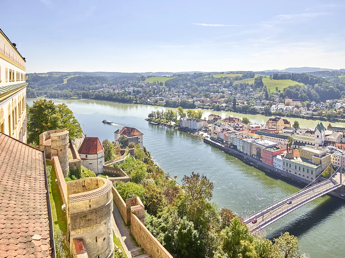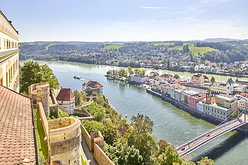 From Passau main station, the tour starts on the Danube cycle path upstream via the impressive Kachlet hydroelectric power station in the direction of Vilshofen. You reach the small river Gaißa, which you follow uphill through the idyllic "Gaißatal" nature reserve. The route leads through the forest area around the Dachsberg on well-maintained forest paths. Above the slopes of the Danube, the route now leads at ground level to the Veste Oberhaus castle complex. As one of the largest preserved castle complexes in Europe, it towers above the town and is not only a magnificent cultural monument, but also contains several museums and a viewing tower that offers a 360-degree panoramic view from the roof. A unique and fascinating spectacle of nature and colour can be admired from the Veste: the blue-brown Danube, the green Inn and the black Ilz unite at the Dreiflüsseeck and flow on together as the Danube. Return via Rennweg with a view to the right of the impressive remains of the ruins of Hals Castle (privately owned), a once mighty count's castle that towers over the Ilz on a steep rocky ridge in the Hals district. The tour leads downhill along Neue Rieser Straße towards the city centre. A short stop at the "Schönblick-Kurve" (car park) is rewarded with a magnificent view of Passau's old town, which is just waiting to be discovered.